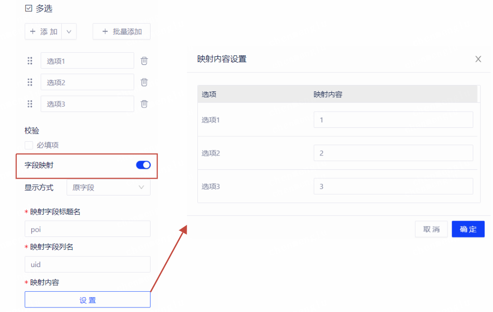 • 勾选字段映射后,设置映射字段标题、映射字段数据库列名和映射内容