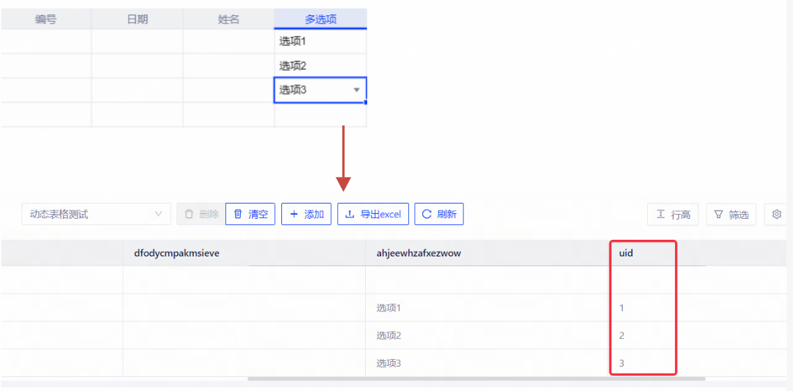 (3)动态表格/流式表单:选项字段支持配置码值作为入库依据