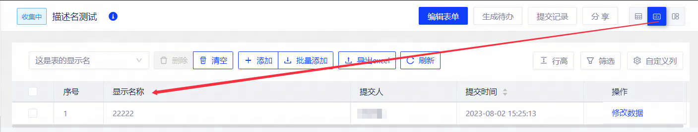 • 在制式表单的数据模式下,列名称用字段显示名展示,若显示名为空,则用数据库列名