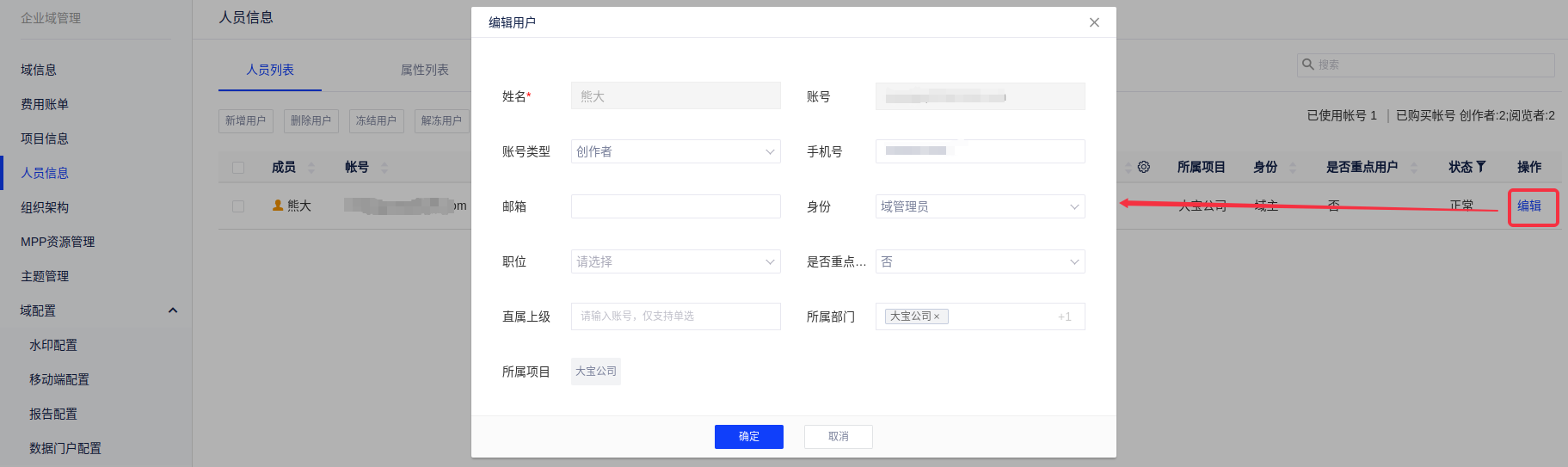 由域主或域管理员进行设置,[企业域管理-人员信息-人员列表-编辑]