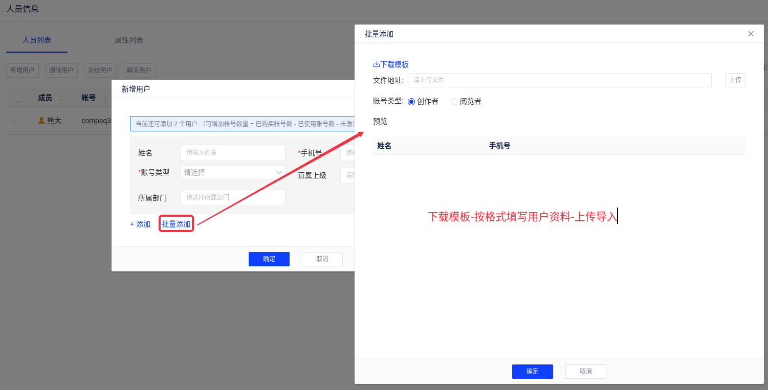 如果人数多,可用弹窗内的批量添加方式导入用户;