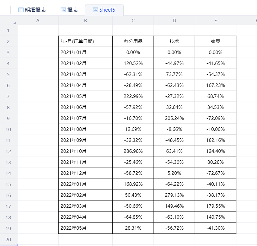将“类别”设置为分区,“订单日期”设置为寻址,其结果为根据类别划为三个分组,每个分组按月份计算与前一项的百分比,如下图所示。