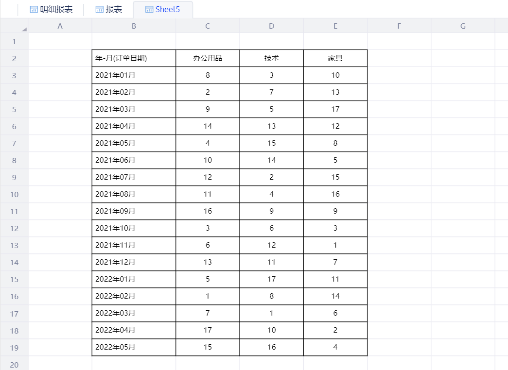 将“类别”设置为分区,“订单日期”设置为寻址,其结果为根据类别划为三个分组,每个分组按月份计算与之前所有项的累计,如下图所示。