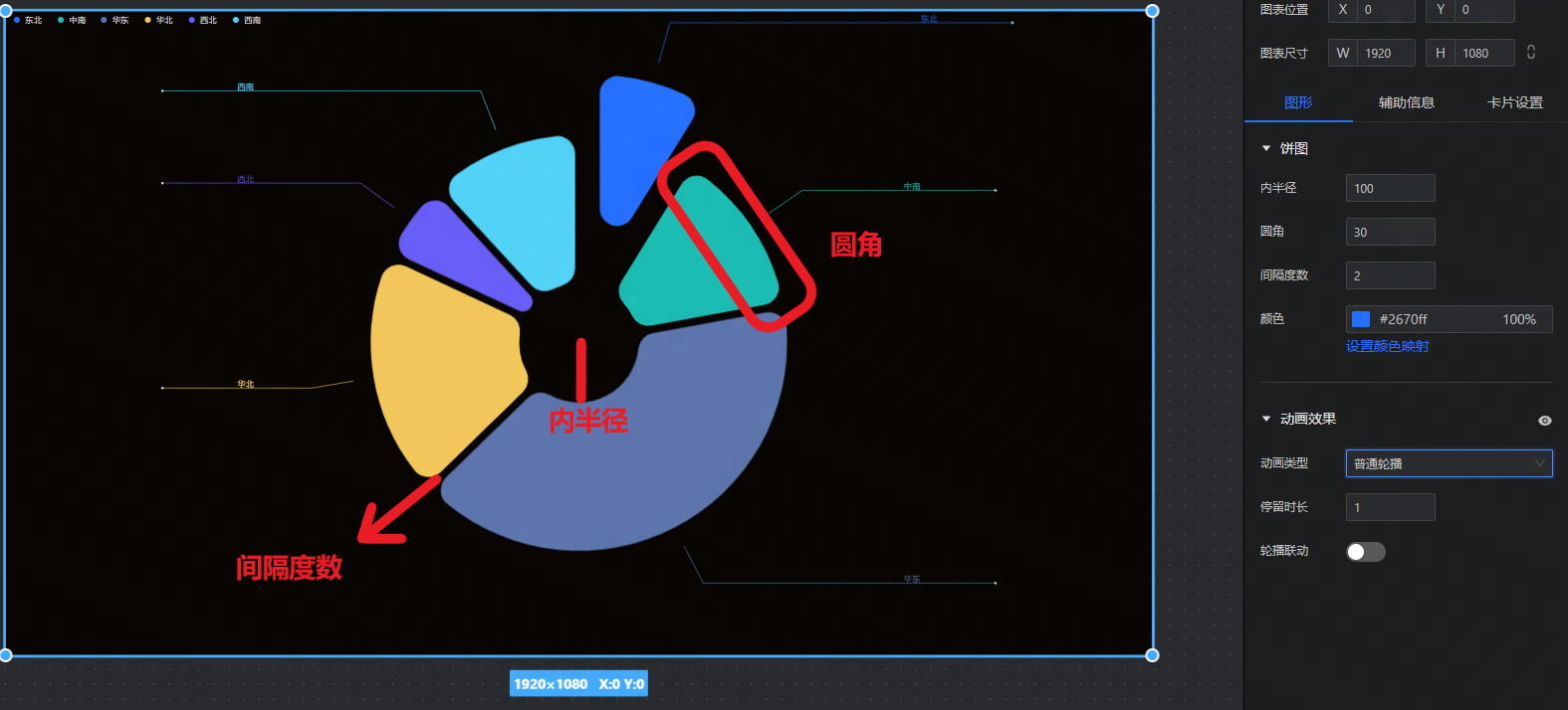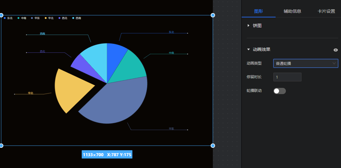 - 动画效果:设置饼图的自动轮播效果。