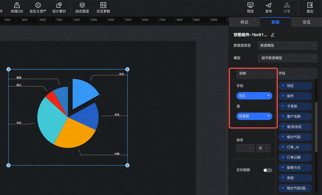 - 字段:设置饼图的维度字段,如下图中的“地区”字段。