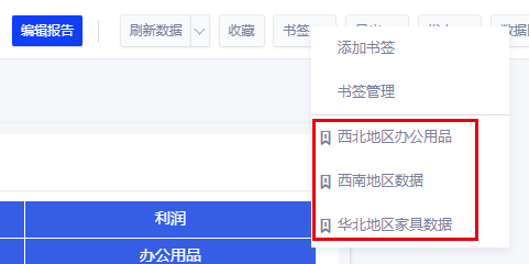 (5)作为报告的制作者,如果事先知道不同读者对数据的侧重点,也可以提前针对不同读者提前添加多个书签,报告的读者可以直接访问书签快速筛选报告数据。