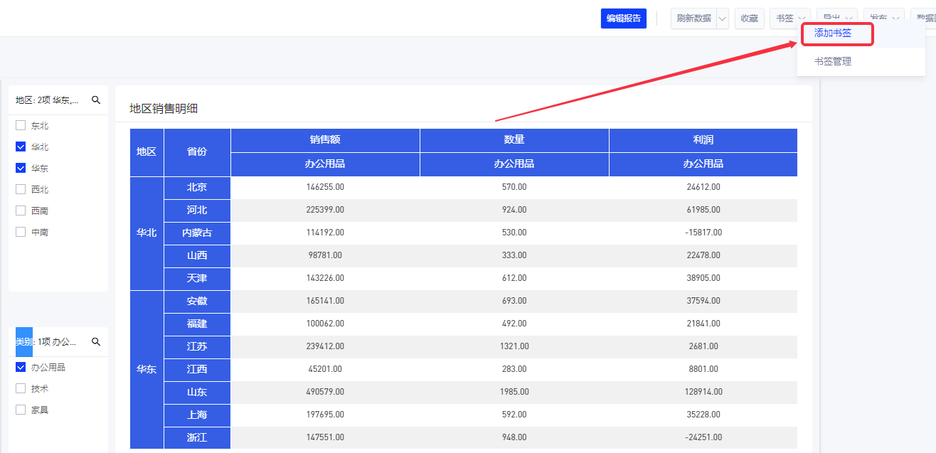 (2)若需要经常查看华北、华东两个地区办公用品的销售额,可以将当前报告的状态保存成一个书签,下次访问书签,报告将自动进入到书签记录的状态(本例中,即地区筛选器选中“华北”和“华东”,类别筛选器选中“办公用品”);