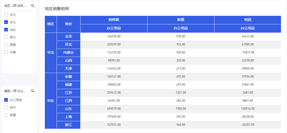 (1)如下图,我们通过筛选查看华北、华东两个地区办公用品对应的销售额数据;