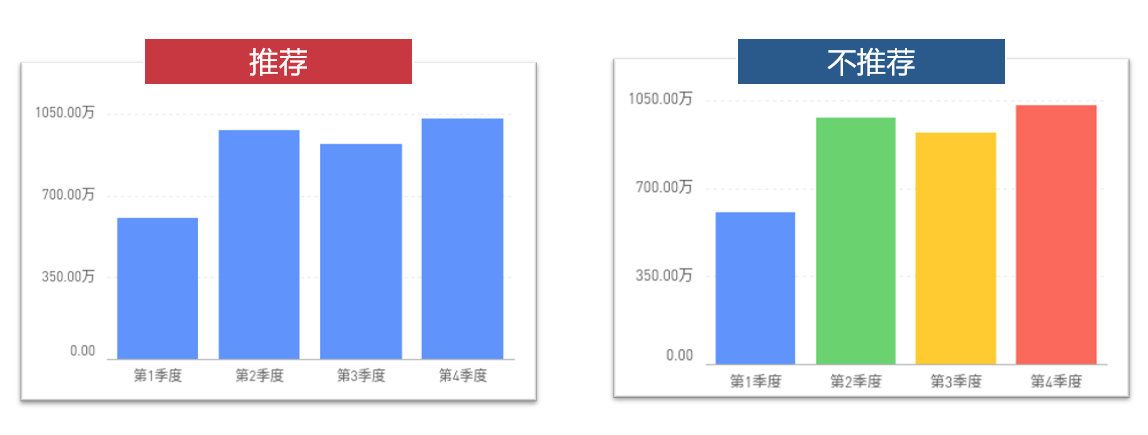 (4)颜色使用要一致,柱状图最好使用一种颜色,但如果有特别需要突出的数据也可以使用另外一种醒目的颜色区分。