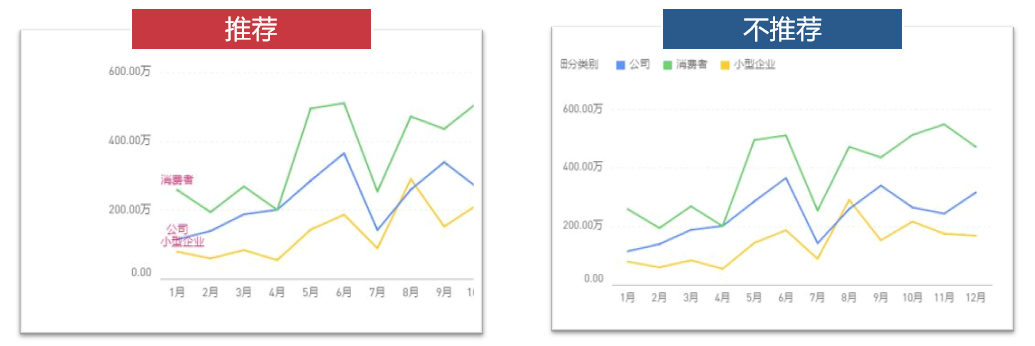 (3)直接在首末端加入文本标签,让读者读完折线图后立即能知道不同颜色所代表的数据,不要让其读完图后再去看图例。