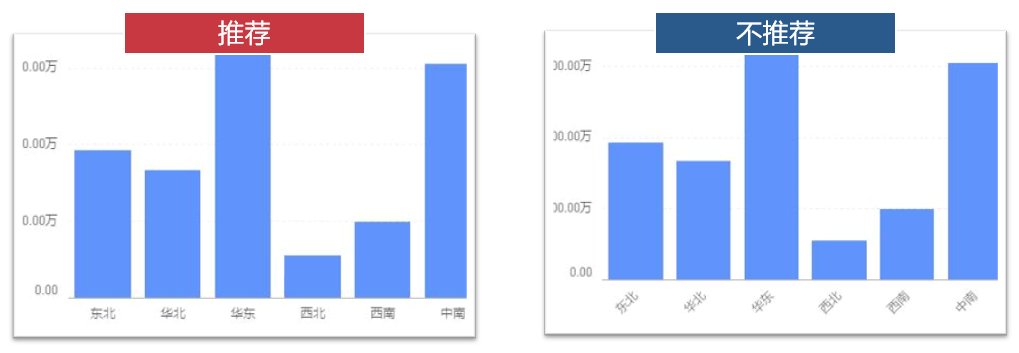 (3)Y坐标轴的数值要从0开始,如果越过0设置坐标轴原点,那么将无法精确表达整体数值。