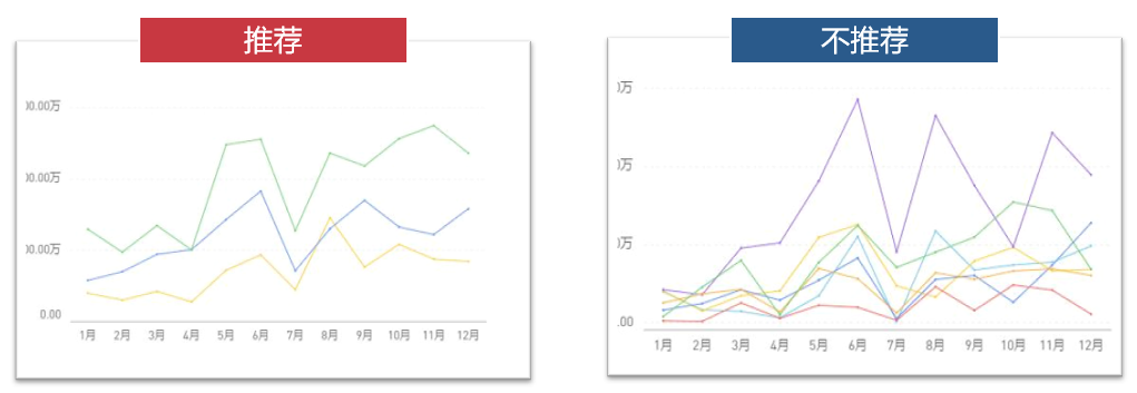 (1)涵盖的折线尽量不要超过4条,如果要展示的数据超过4组,那么再用一张折线图展示即可。