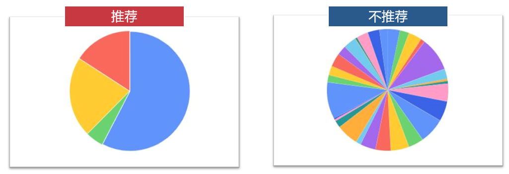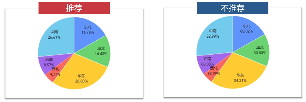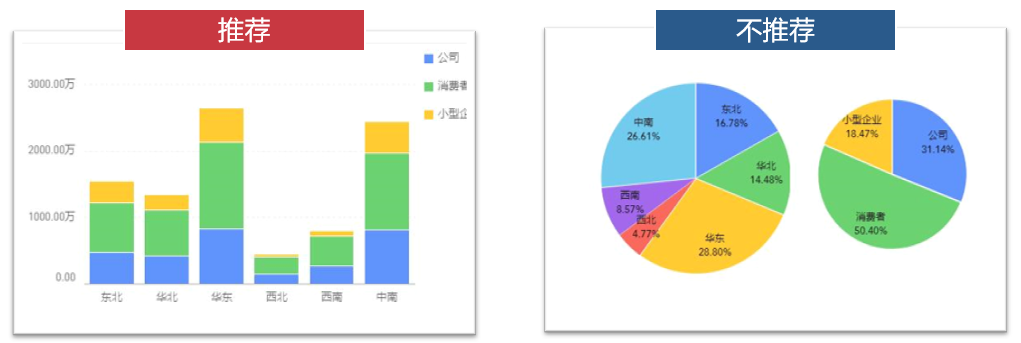 (2)不要使用多张饼图展示对比关系,饼图很难用来展示对比关系,建议使用柱状堆叠。