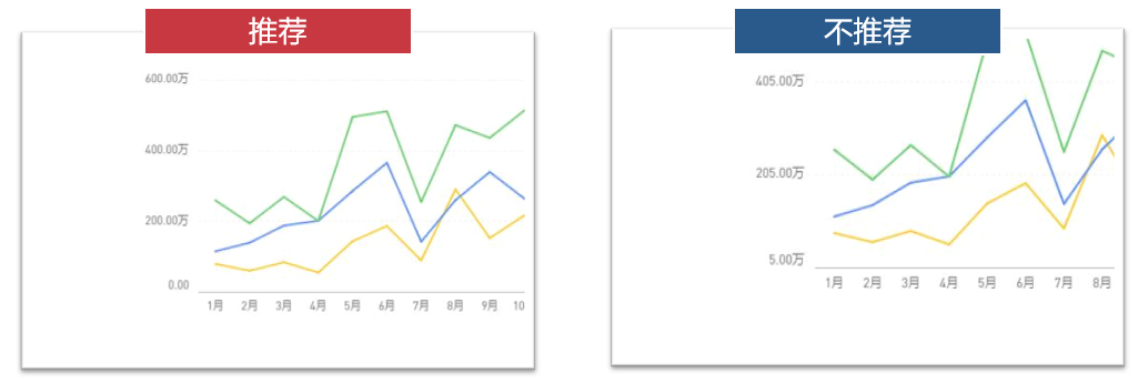 (2)坐标轴要尽可能包括0基准线,尽管折线图无需从0基准线开始,但尽量要包含,如果某些小范围波动意义非凡,可以截短比例来展示这些变化。