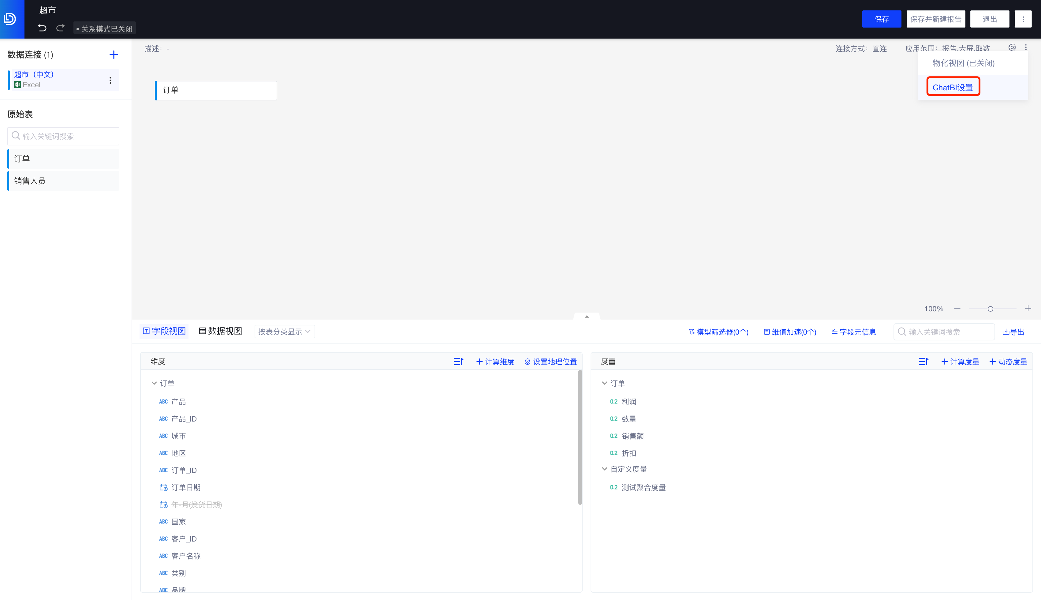 项目管理员或模型编辑者进入数据模型的编辑界面,在模型「更多」操作按钮下选择「ChatBI设置」,并在设置中打开ChatBI的开关。