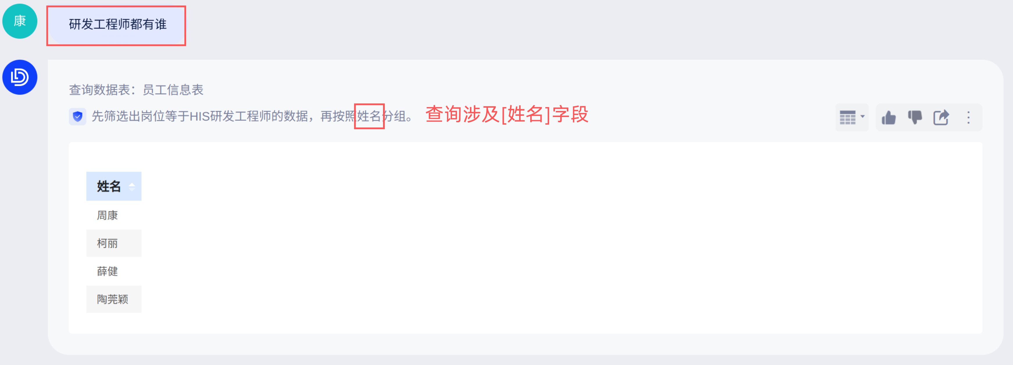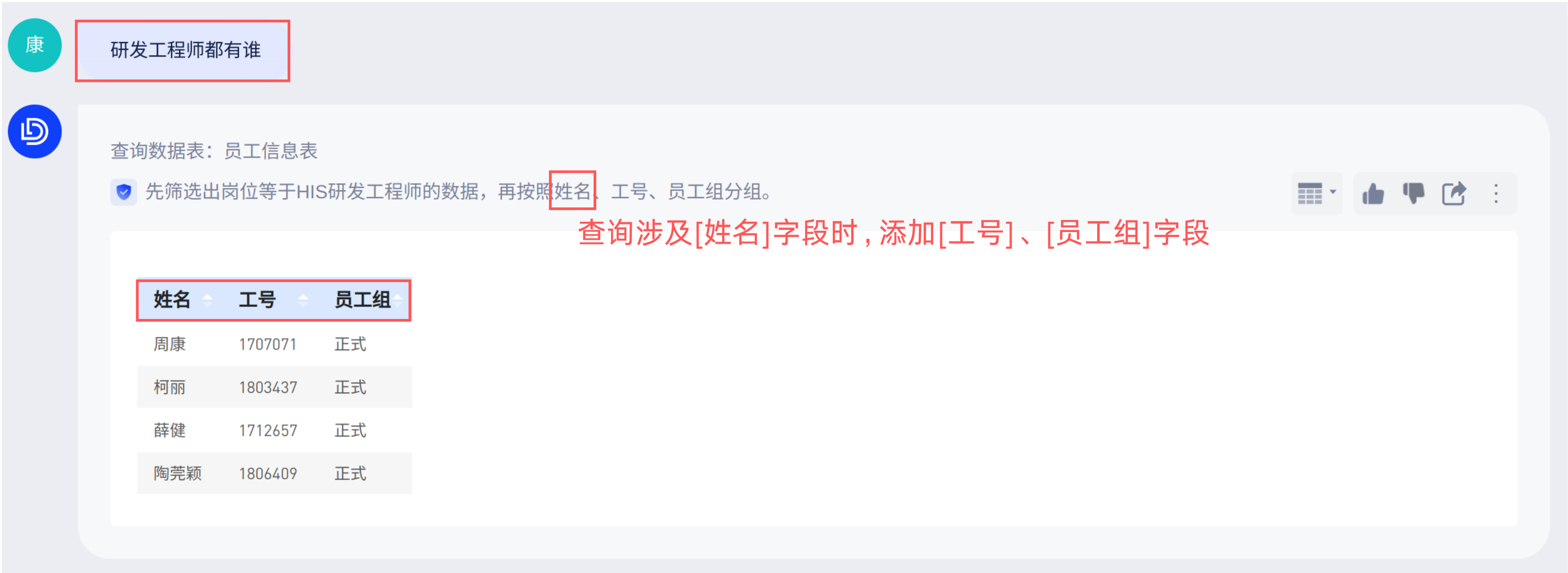 「人员信息表」包含人员的基础信息明细数据,当你查询“研发工程师都有谁”时,如果你希望当问题包含[员工姓名]时,同时展示[工号] 、[员工组]等信息以方便用户做对照。那就可以设置提示词在“问题包含字段”「工号」,“时,添加”「选择字段」然后在字段列表下拉选择“工号、员工组”字段: