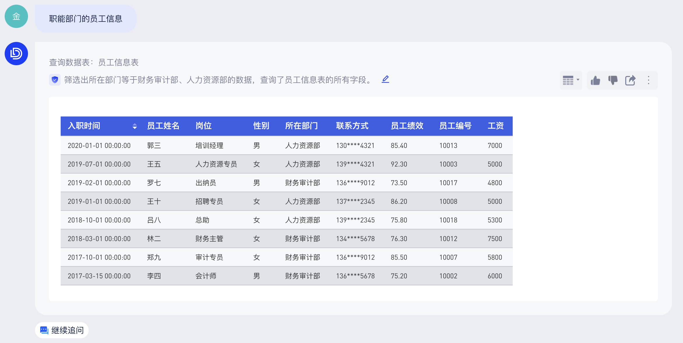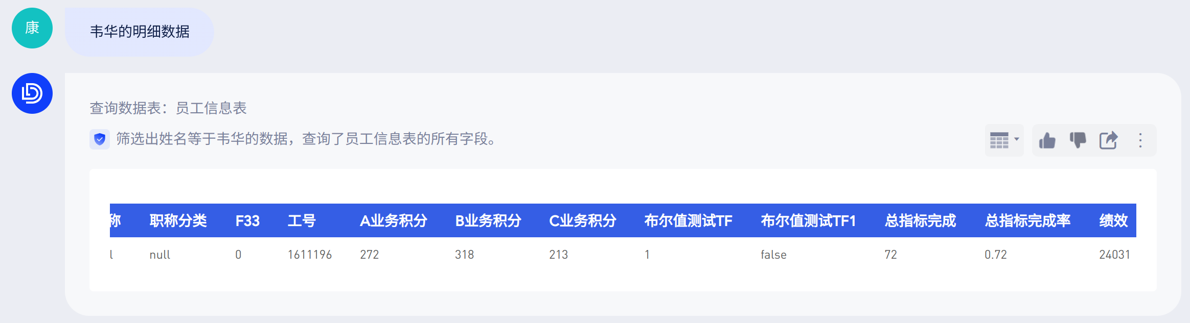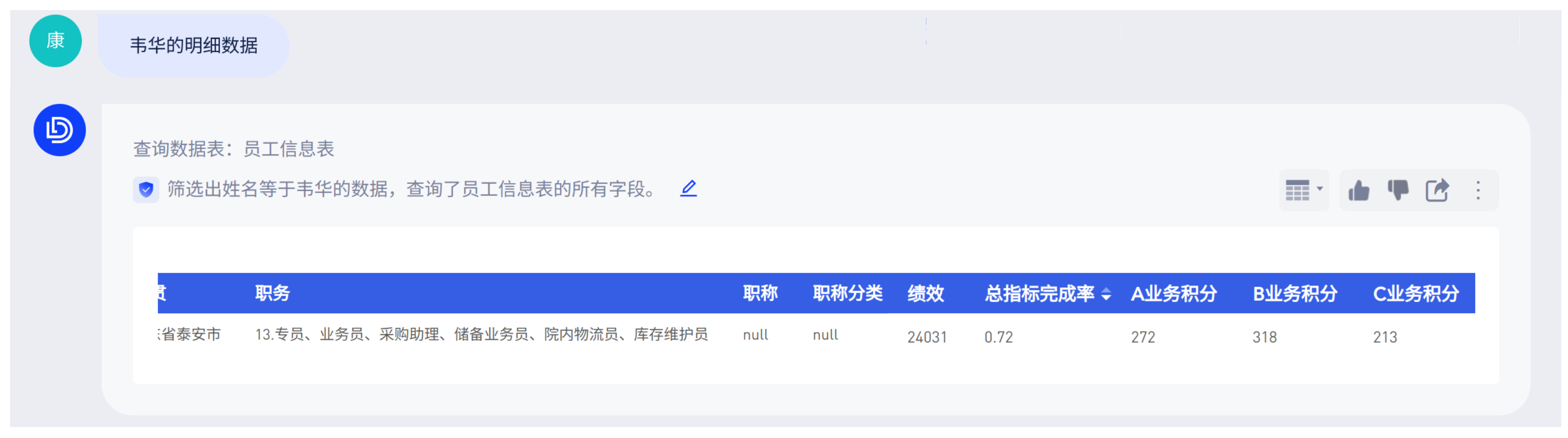日常业务场景中,用户习惯于用“市场部”来指代“市场营销部”。当询问“市场部有多少人”的时候,大模型能够了解用户实际想询问“市场营销部有多少人”,查询部门为“市场营销部”的所有数据。