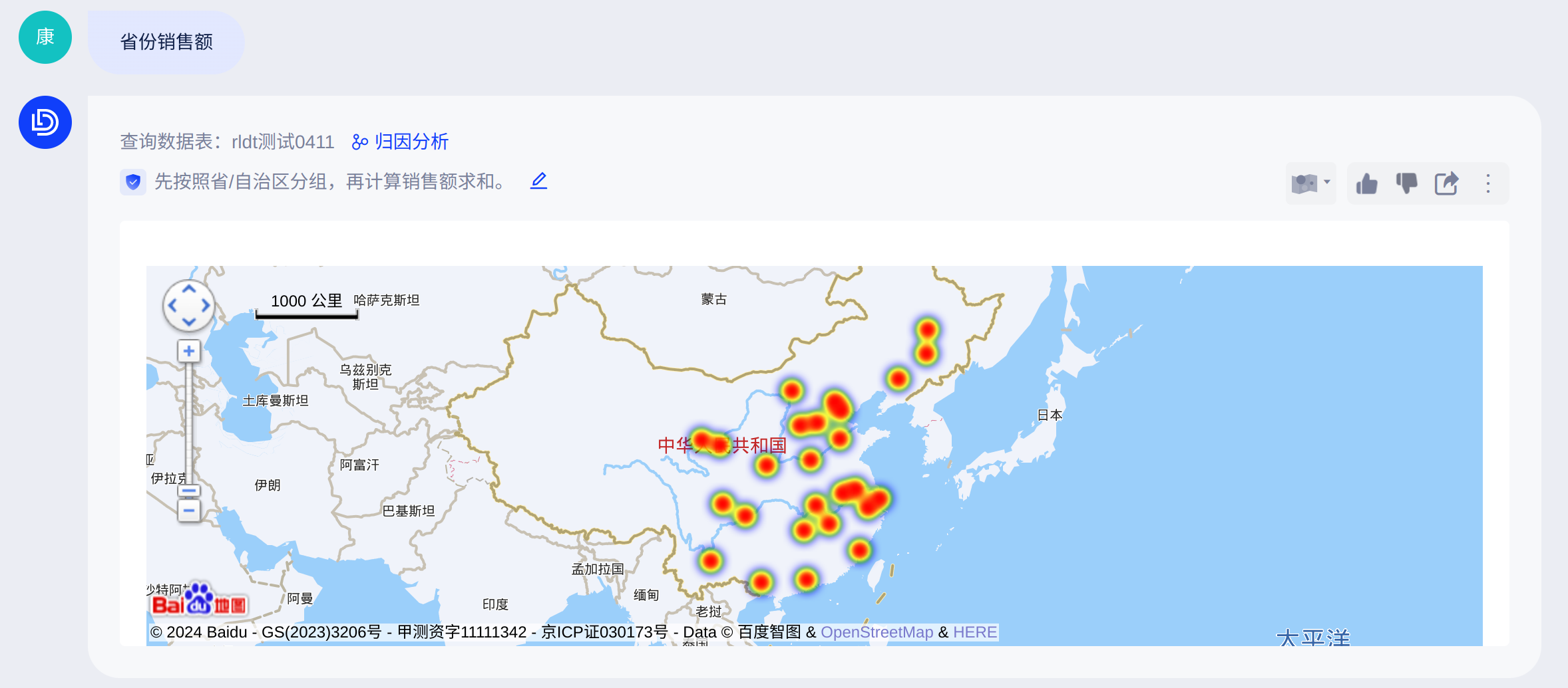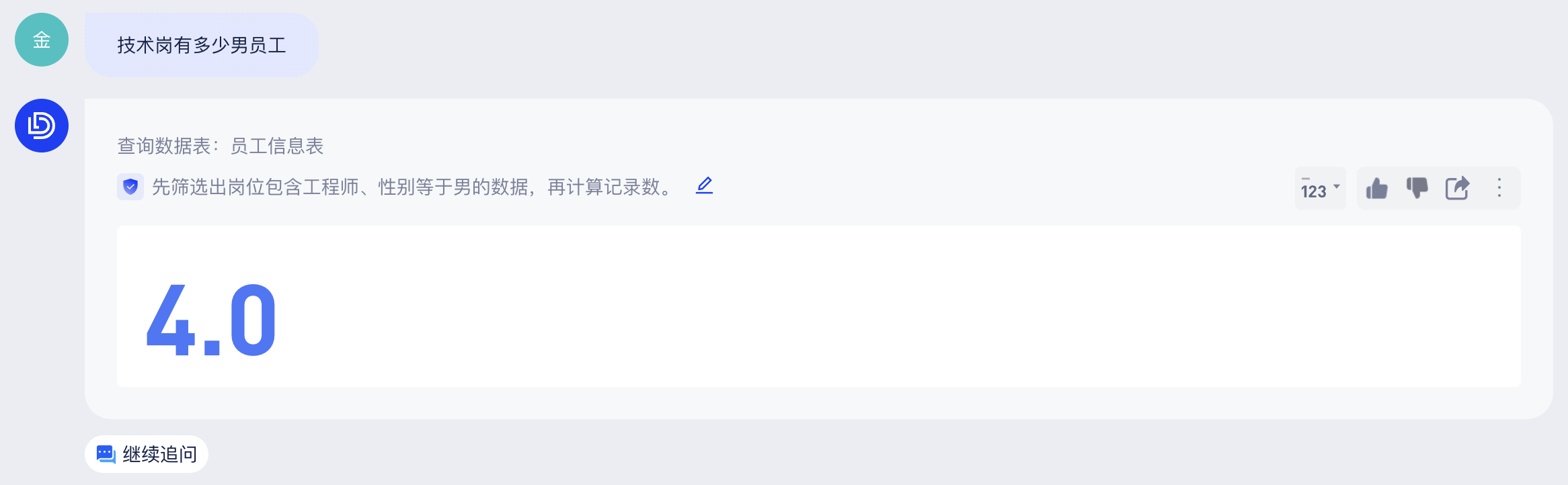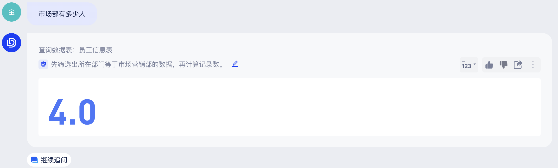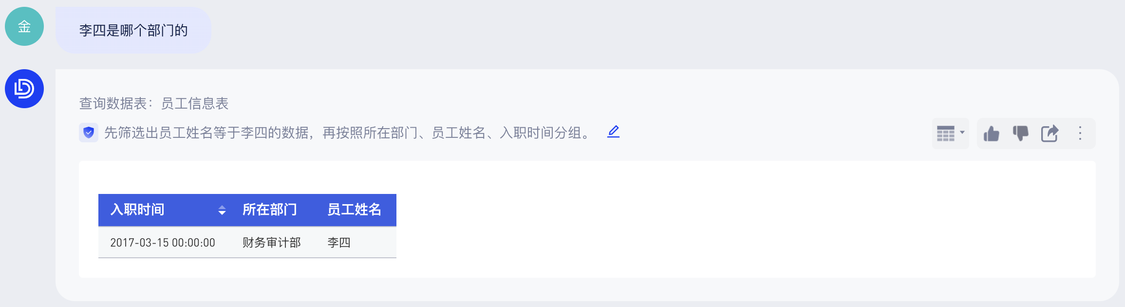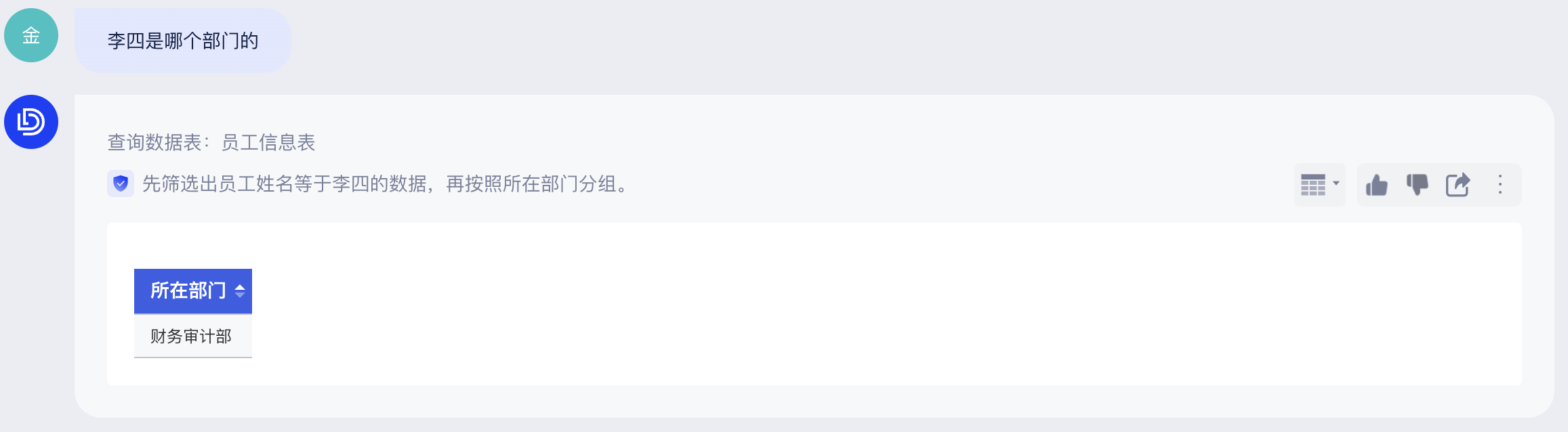 当你再次基于这个表格问问题“李四是哪个部门的”,可得到不一样的回答: