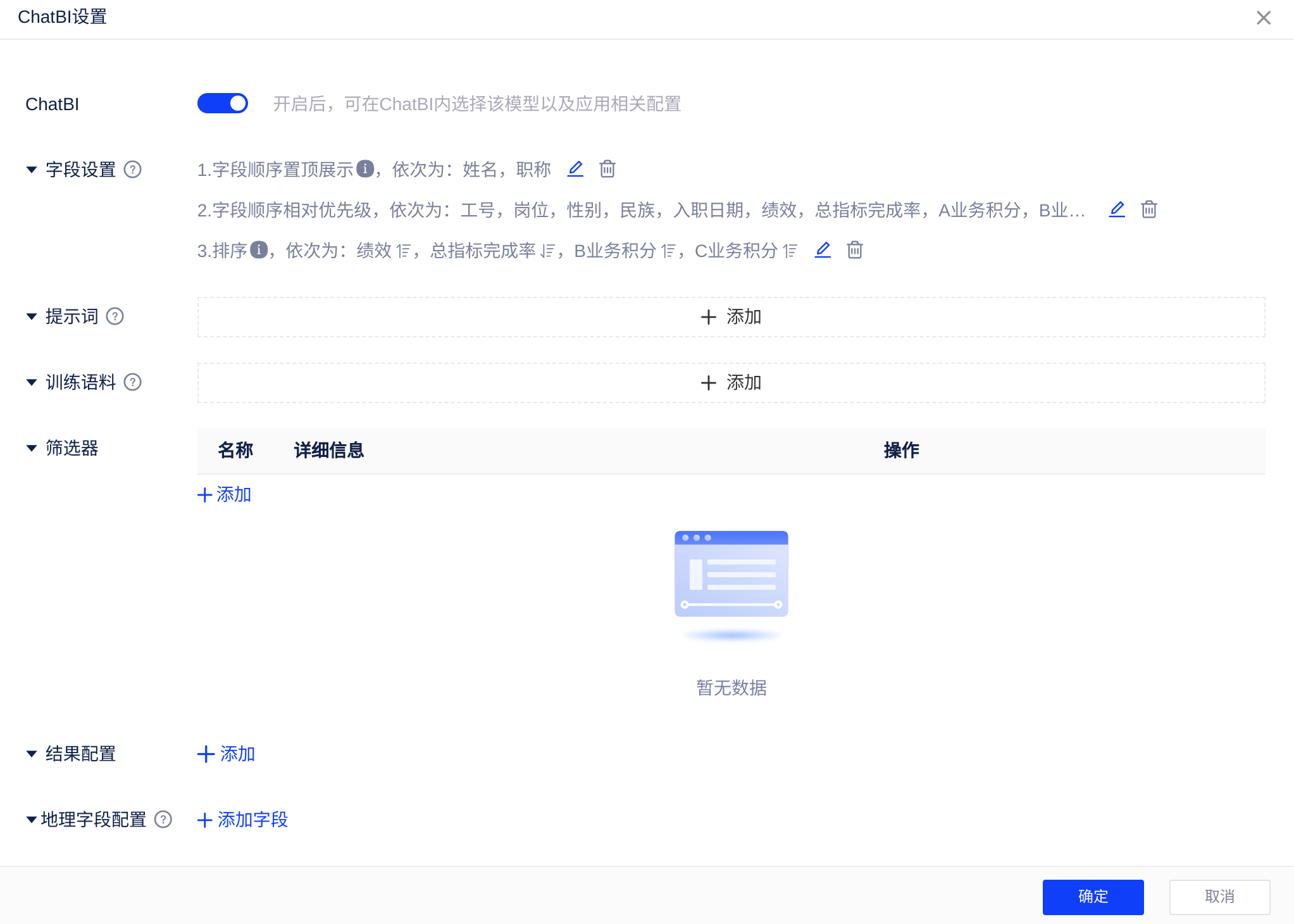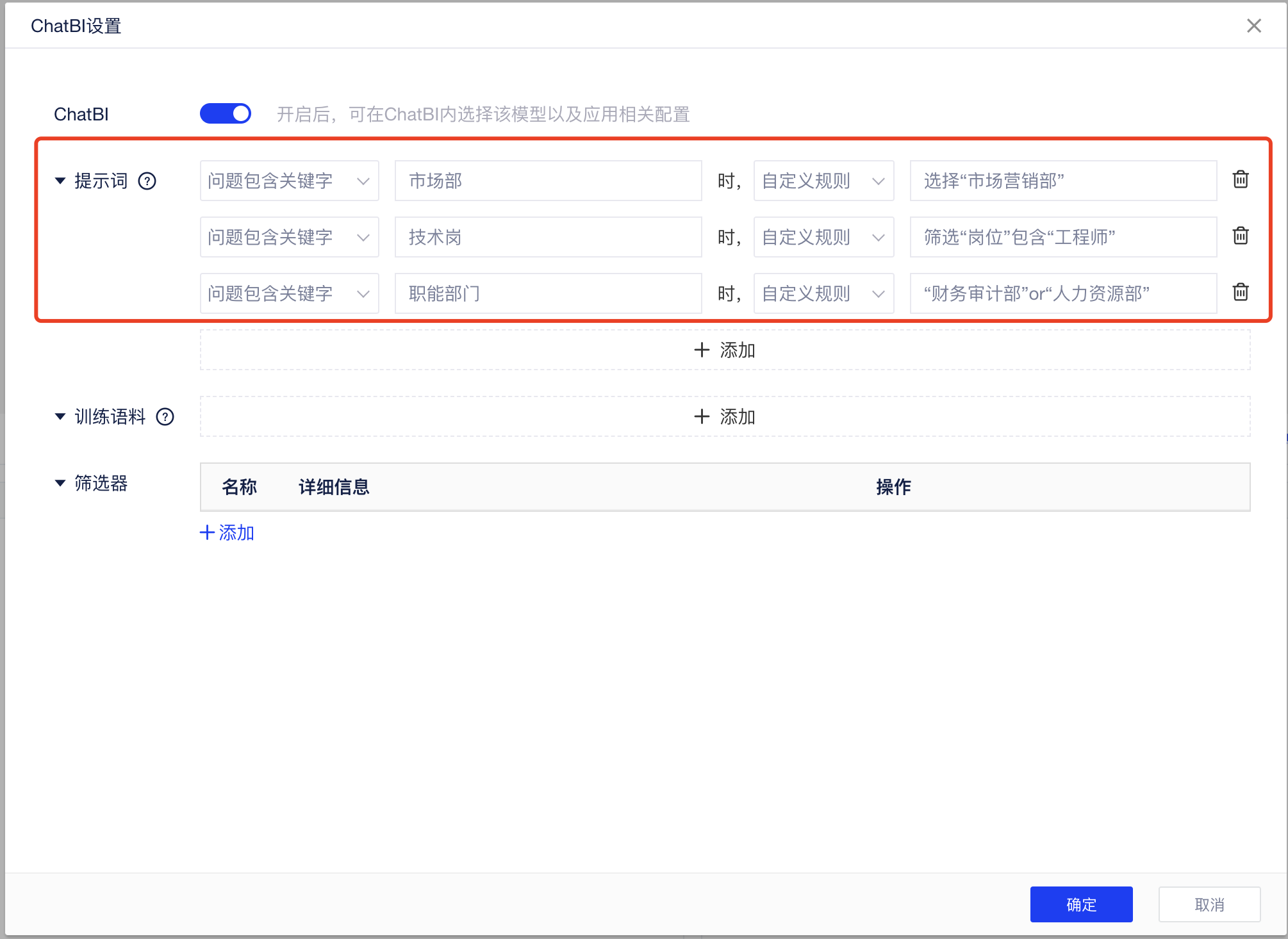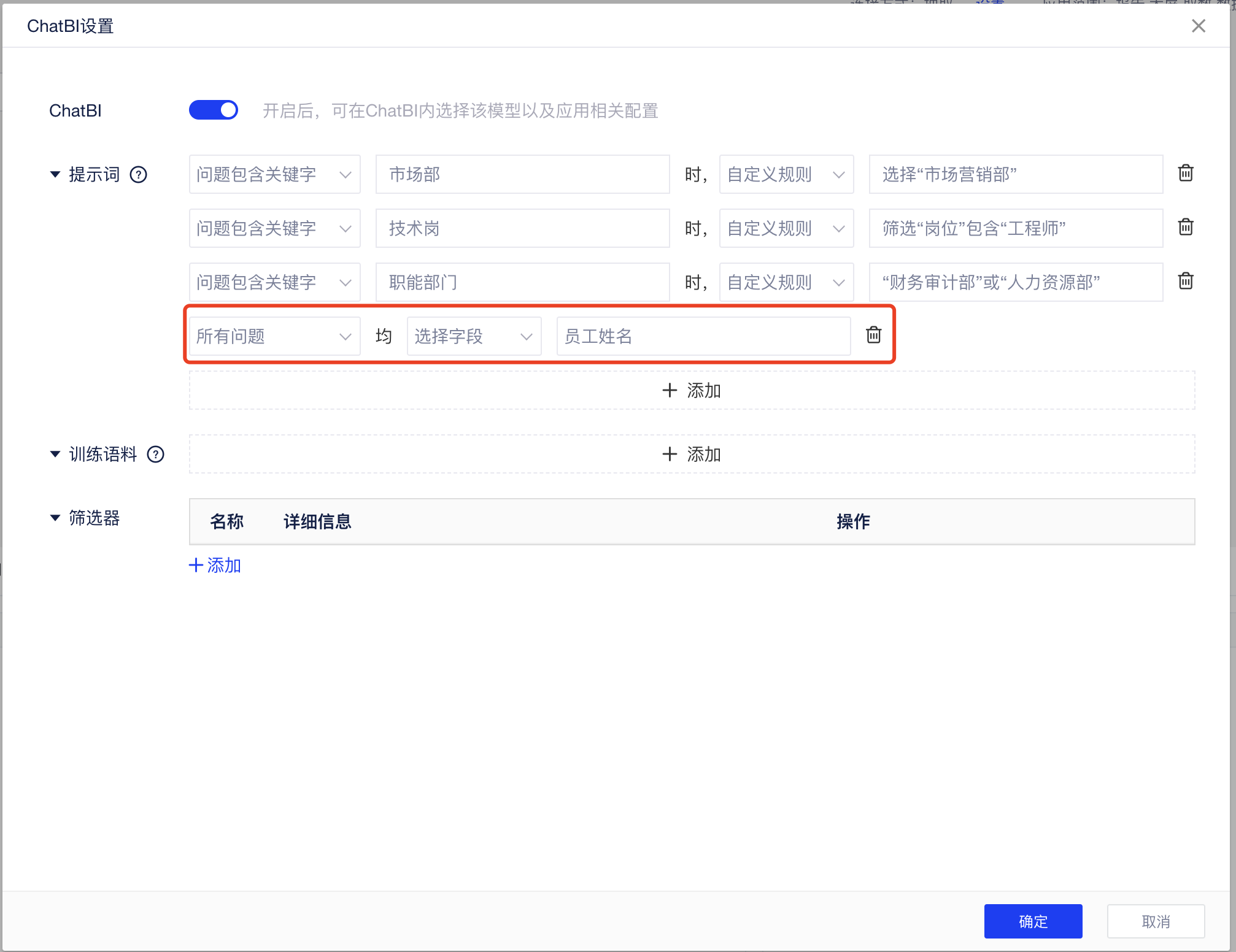 问题包含某些关键词时,让AI大模型按照用户设置的规则去查询,比如现在你要对员工信息进行分析,那么你需要根据企业内部的一些简称和习惯用语,对「员工信息表」做如下配置,让AI也能习得这些知识: