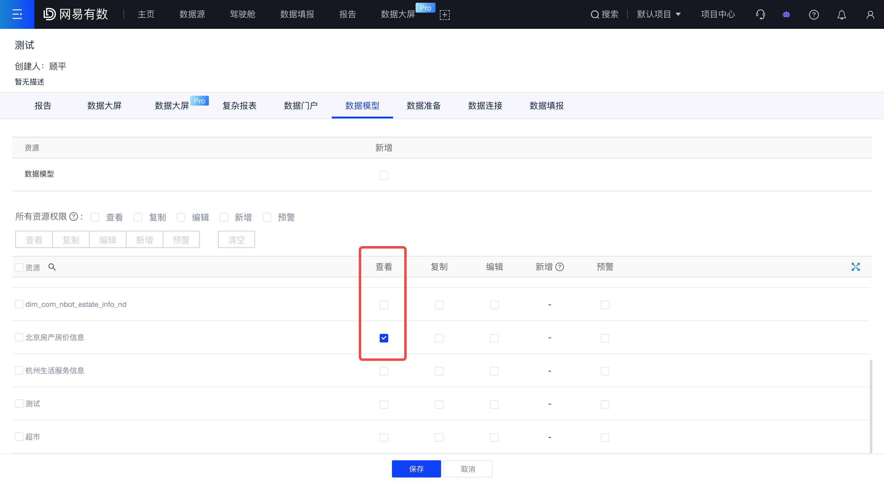 项目管理员在角色管理中,配置数据模型的查看权限,如下图,将配置好的角色赋予用户