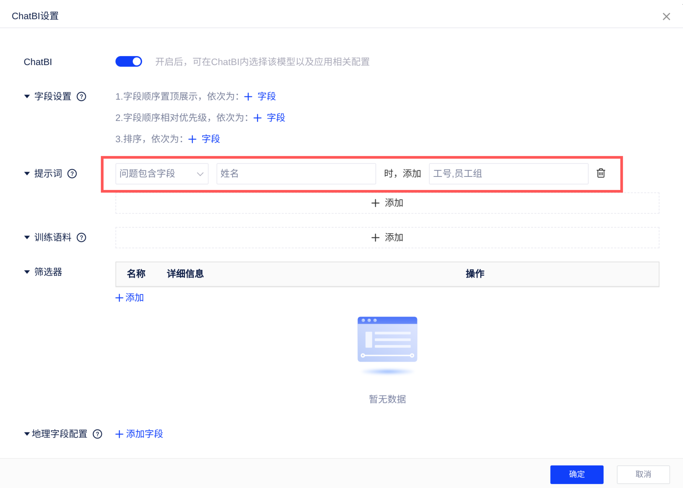 - 填写提示词时,对数据模型中的字段值和字段名都用引号包裹,表示区分;