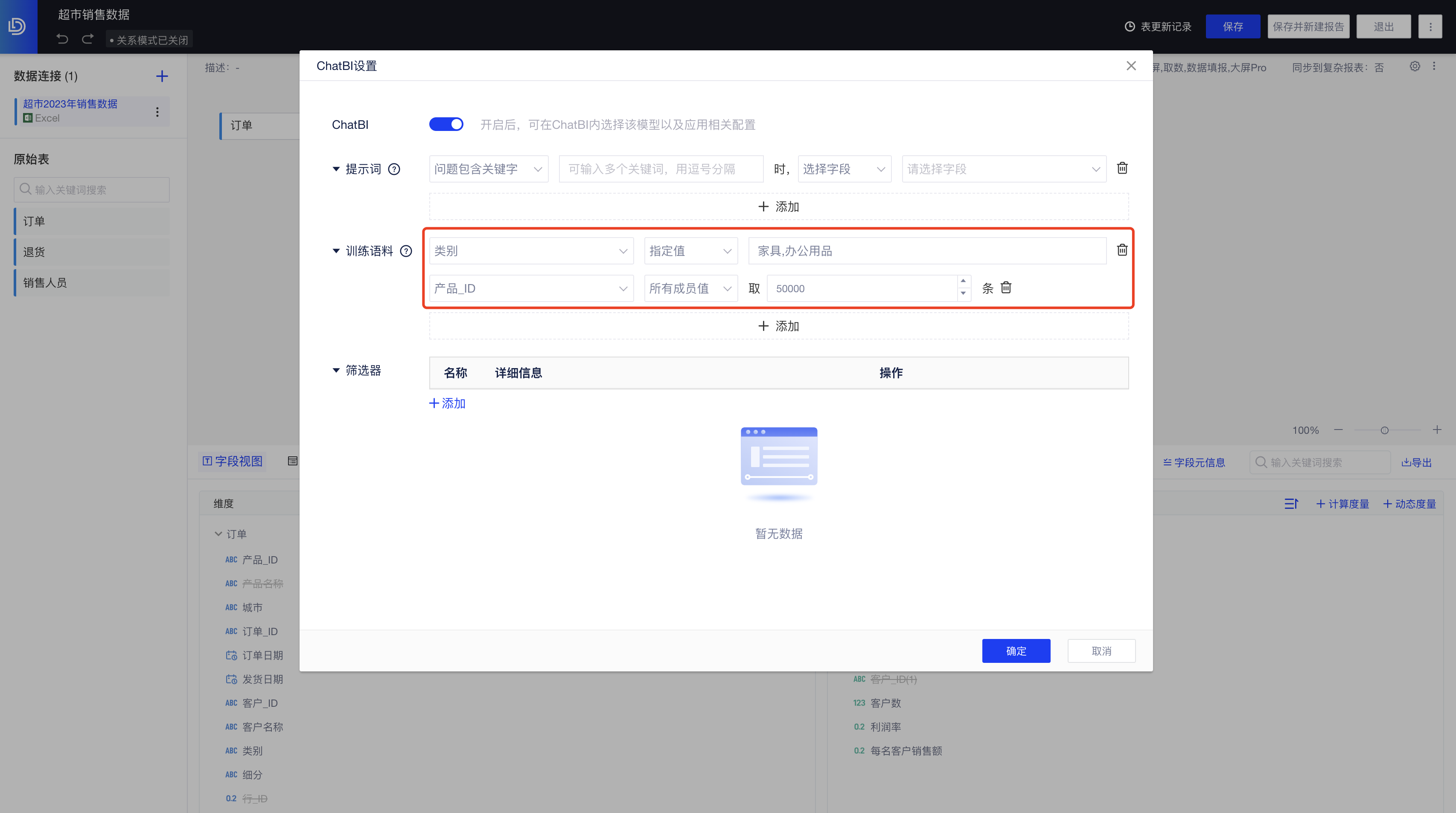 为了让AI大模型能更好地回答您的问题,您可以选择维度字段,提前设置训练语料,我们将自动缓存您所设置的维度成员值,AI将基于这些缓存数据进行预训练,以此提高问答准确率。以“超市销售数据”这个表为例: