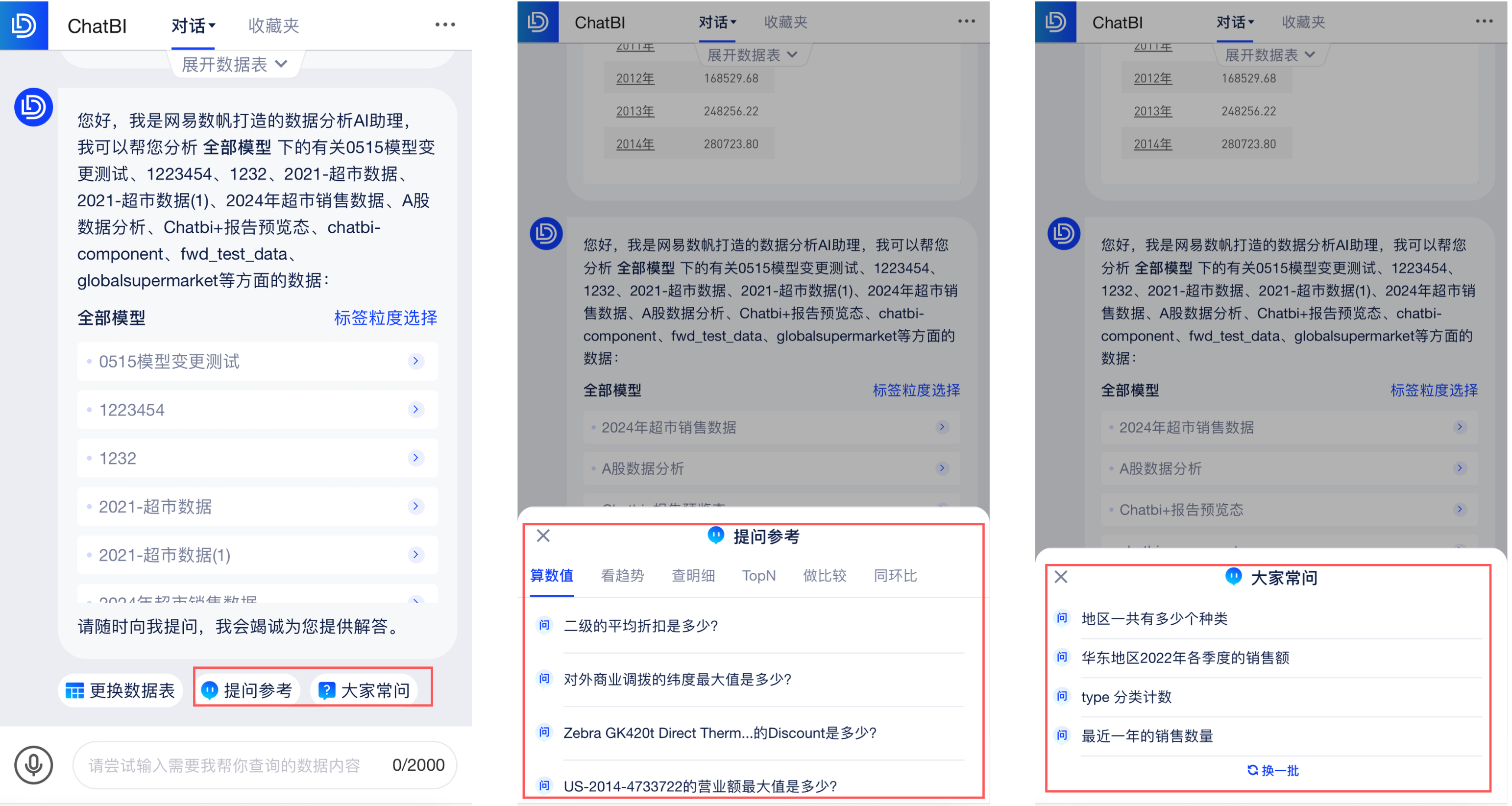 AI助手首先会向你介绍你可以使用的数据表有哪些,并在数据表下方展示六类「提问参考」:算数值、看趋势、查明细、TopN、做比较、同环比。
