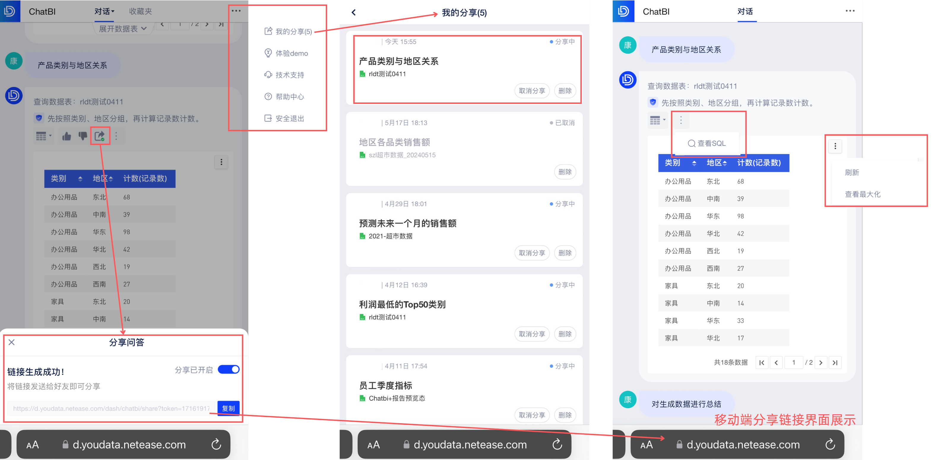 - 如果你想和其他人共享你通过ChatBI问答得到的结果,可以点击问答右上角的「分享」按钮,通过复制分享链接,并发送给你想要分享的好友。