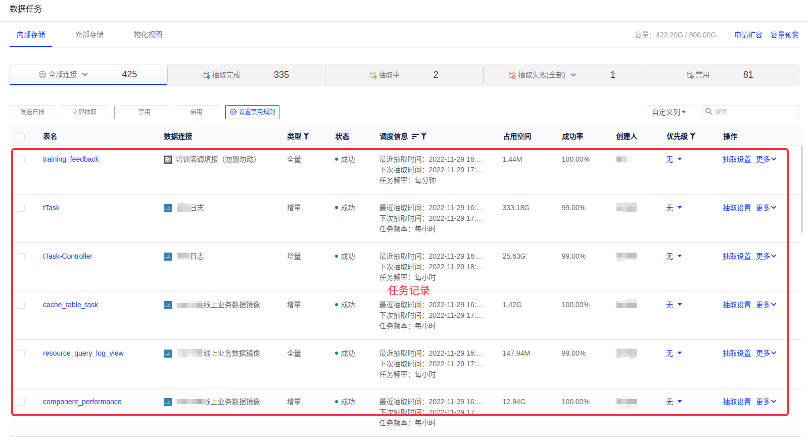 任务记录显示表名、数据连接、类型、状态、失败原因、调度信息、占用空间、成功率、创建人、优先级、操作。