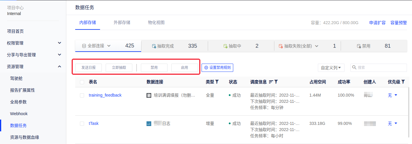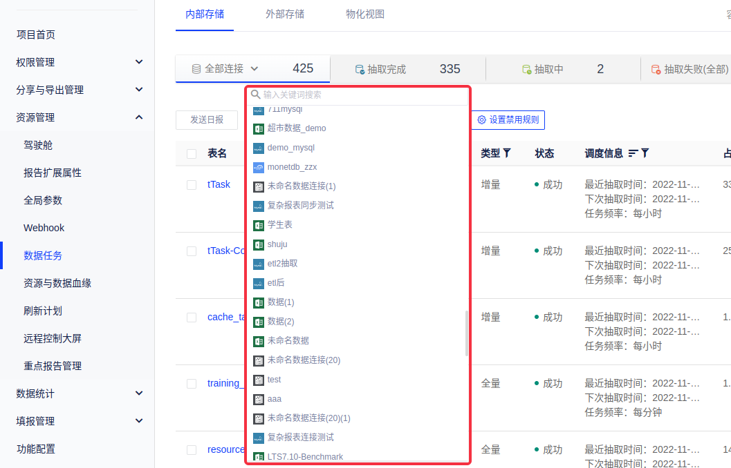 (1)您可按照图中的tab选择内部存储、外部存储和物化视图的任务。对内部存储和外部存储,都可按照tab选择全部连接、抽取完成、抽取中、抽取失败、禁用等不同状态的任务,如图所示;