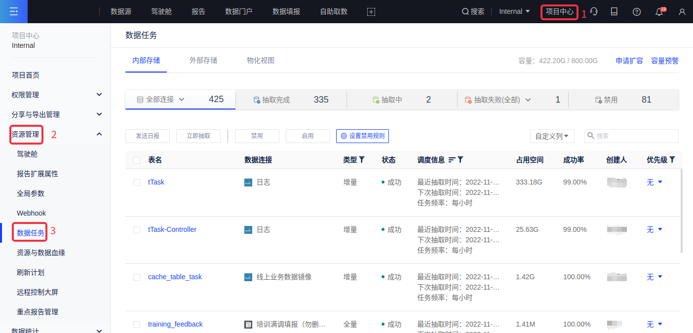 在项目中心的数据任务模块,您可以看到整个项目目前所有的数据任务并对其进行管理。