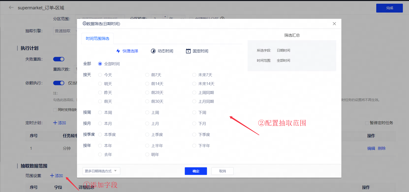 ①用户通过配置字段及抽取范围,自定义抽取数据范围。