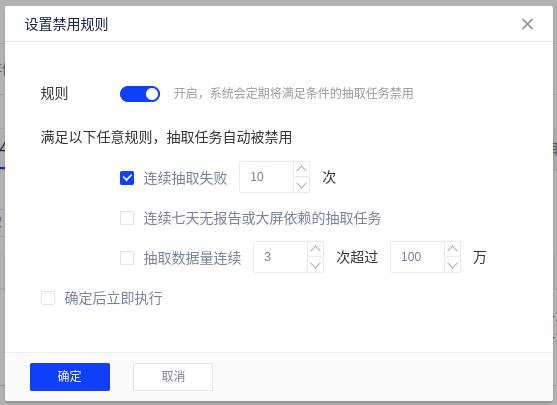 - 规则:连续失败n次、连续七天无报告或大屏依赖的任务、数据量连续n次超过x万;满足规则的抽取任务自动被禁用,同时可选择确定后立即执行