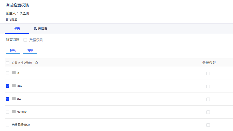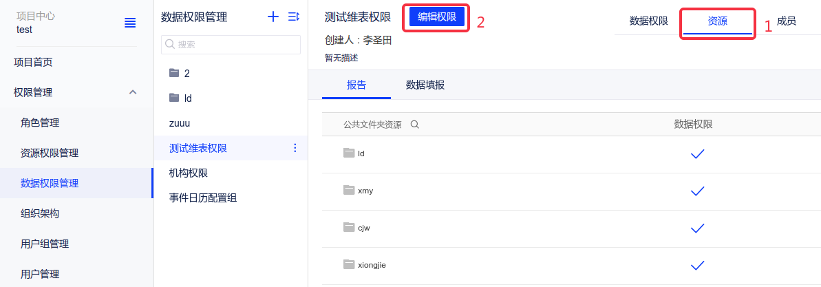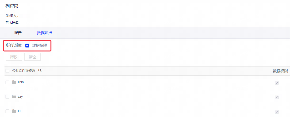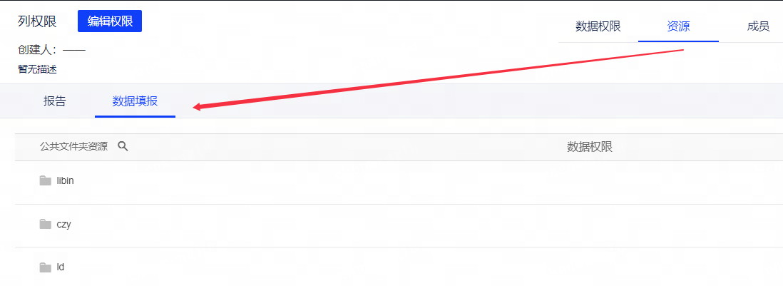 • 原数据权限管理-资源tab下的报告旁新增了【数据填报】tab