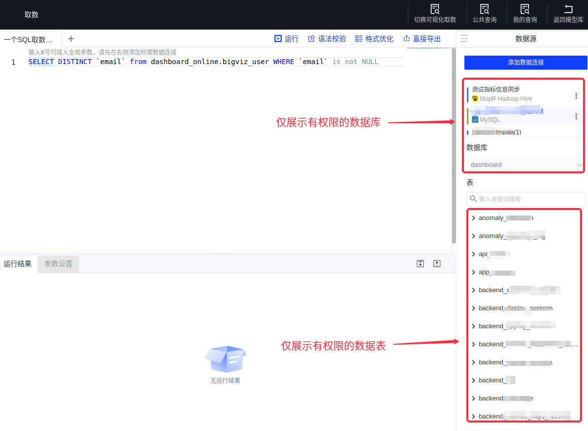 • 自定义sql取数只能展示和使用有权限的数据库数据表