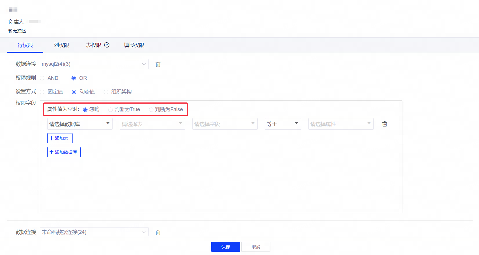 (1)在表权限设置界面,选择需要设置访问权限的数据连接,不支持内置连接;