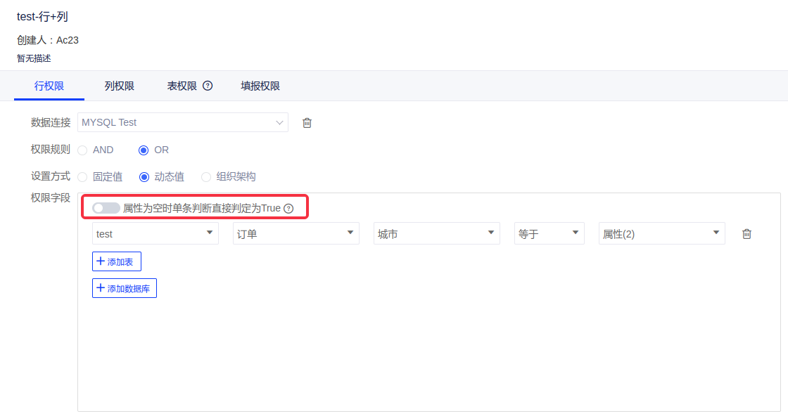 • 如A用户的用户属性【部门】为空,设定单条判断“【订单】表【地区】字段等于【部门】”,若开关关闭,则忽略该单条判断,否则则判定为True