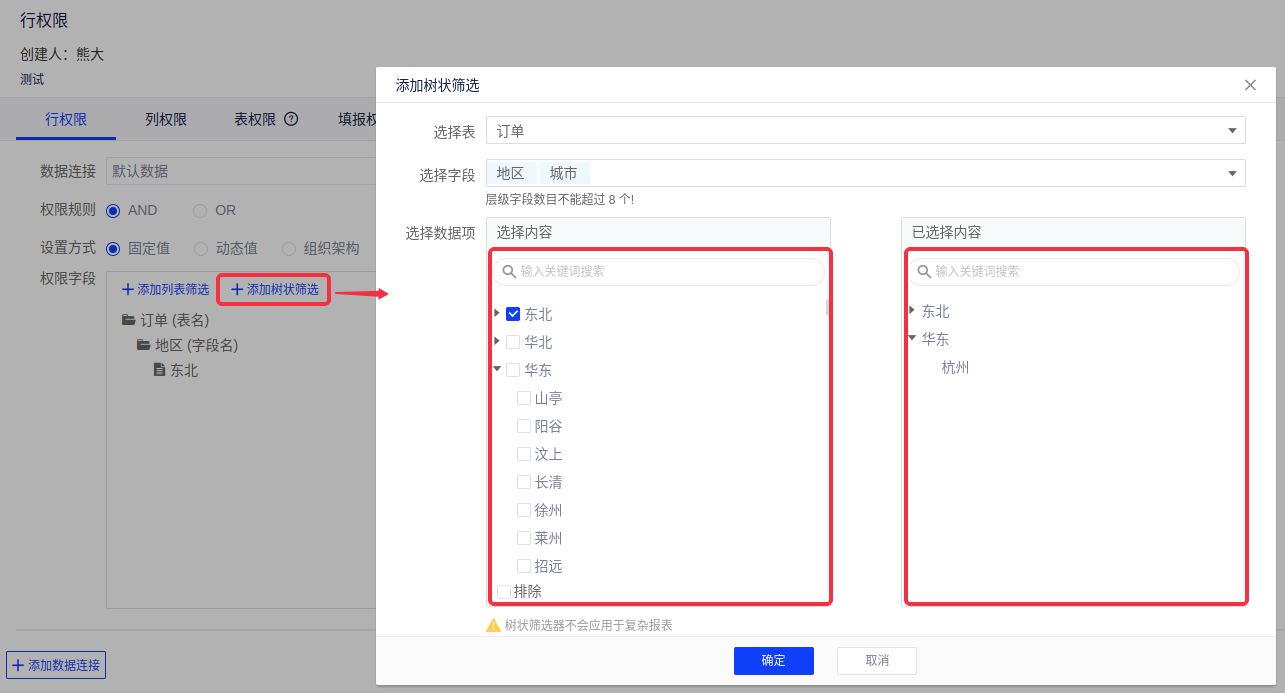 例1:添加列表筛选中【选择表】中选择“订单”,【选择字段】中选择“订单”下“地区”字段,【选择数据项】可手动输入“东北”或列表筛选勾选“东北”,将该“数据行级权限”赋予给东北大区的销售人员,则他们在访问相关报告时,只会看到“东北”地区的数据。