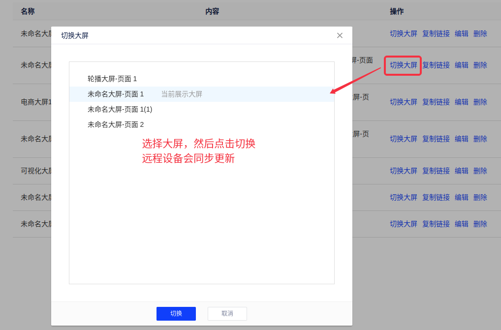 为了更加流畅的在不同的大屏之间进行切换,本产品提供了大屏的远程切换功能。