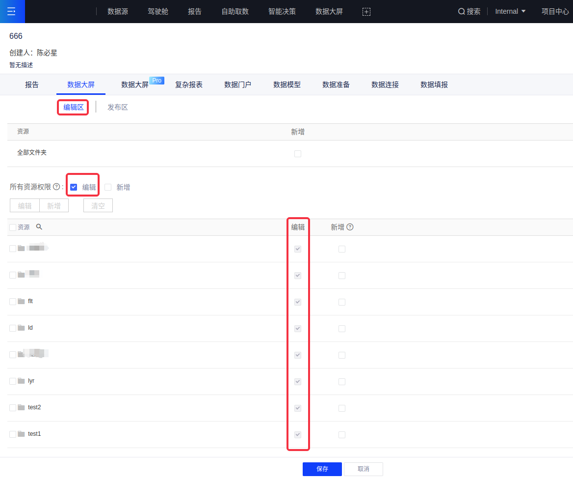 (2)如果只在权限管理的发布区对角色选择了阅览权限,则角色的操作权限只有阅览文件夹下大屏,大屏发布页面没有“去编辑”按钮;