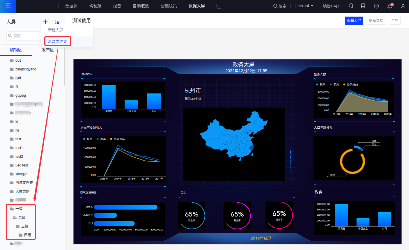 为方便对大屏的管理,产品提供了文件夹管理功能,并按照大屏是否已发布分为编辑区和发布区。