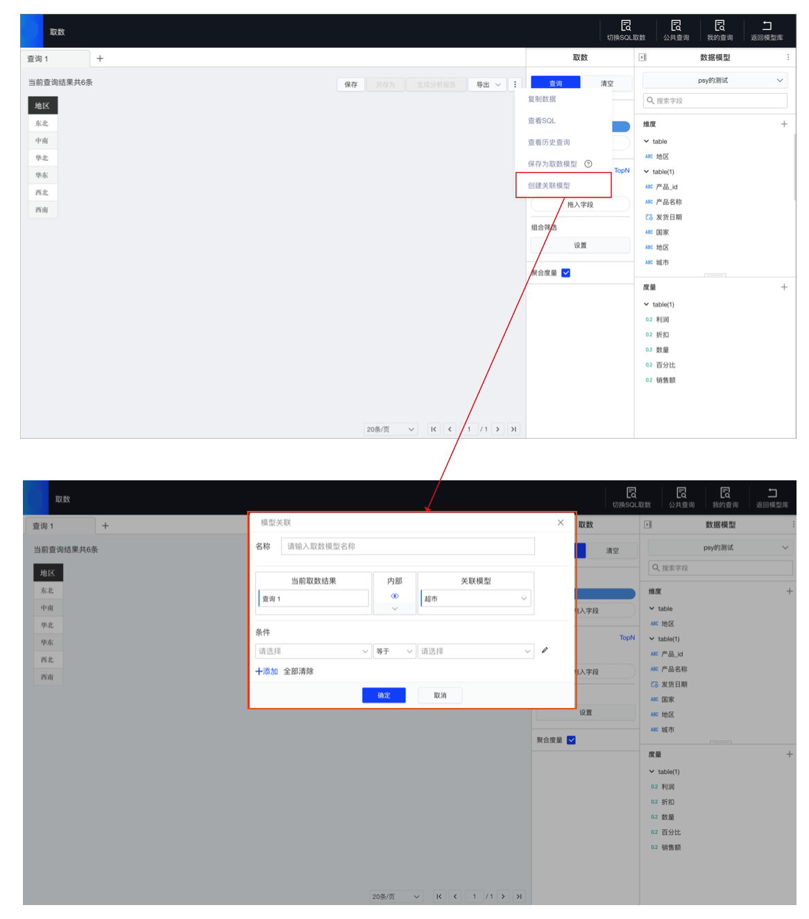 查询结果可以与同一个数据连接下的数据模型进行关联得到新的关联模型。