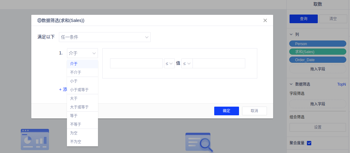 数值筛选:选择某个数值范围进行数据的筛选,可选择的范围包括介于、不介于、小于、小于或等于、大于、大于或等于、等于、不等于、为空、不为空;且允许添加多个条件,筛选满足任一条件/所有条件的数据;