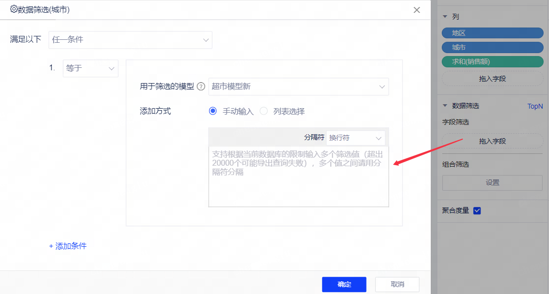- 设置条件可满足全部或任一条件,选择筛选关系,手动输入字段即可添加筛选条件;