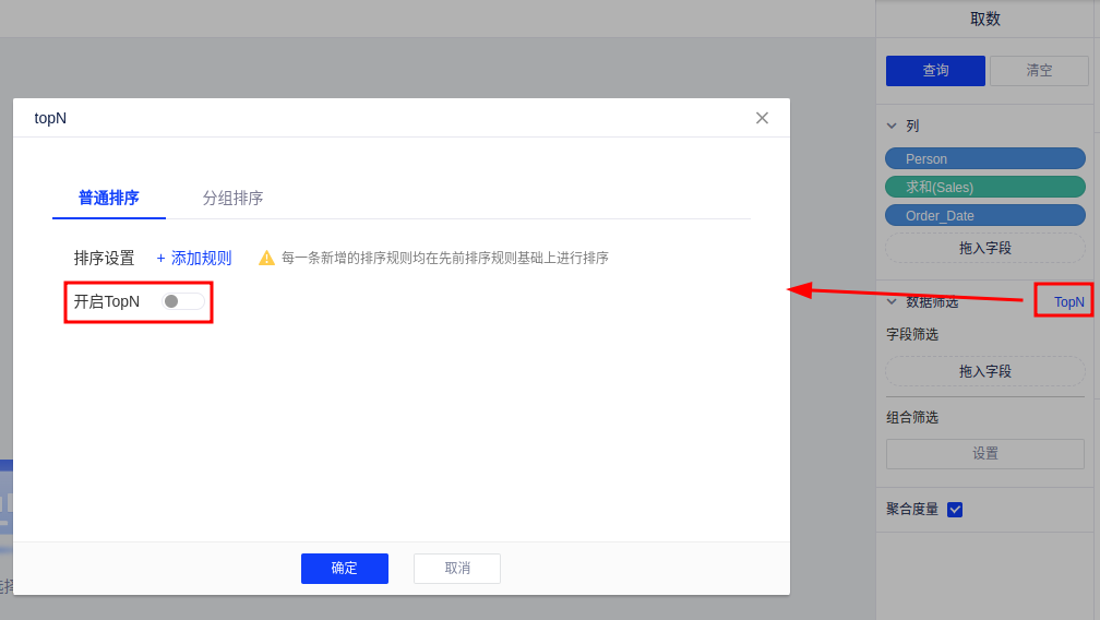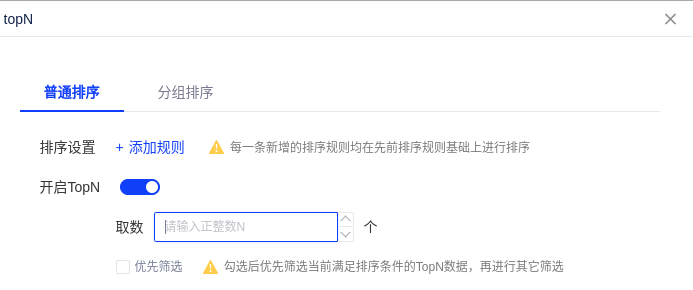 添加规则后,可选择将查询数据的升序降序作为排序,筛选满足条件的前N条数据,且TopN筛选支持设置优先筛选,勾选后优先筛选当前满足排序条件的topN数据,再进行其它筛选: