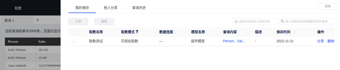 查询结果支持保存为新的取数模型,并支持编辑、分享。