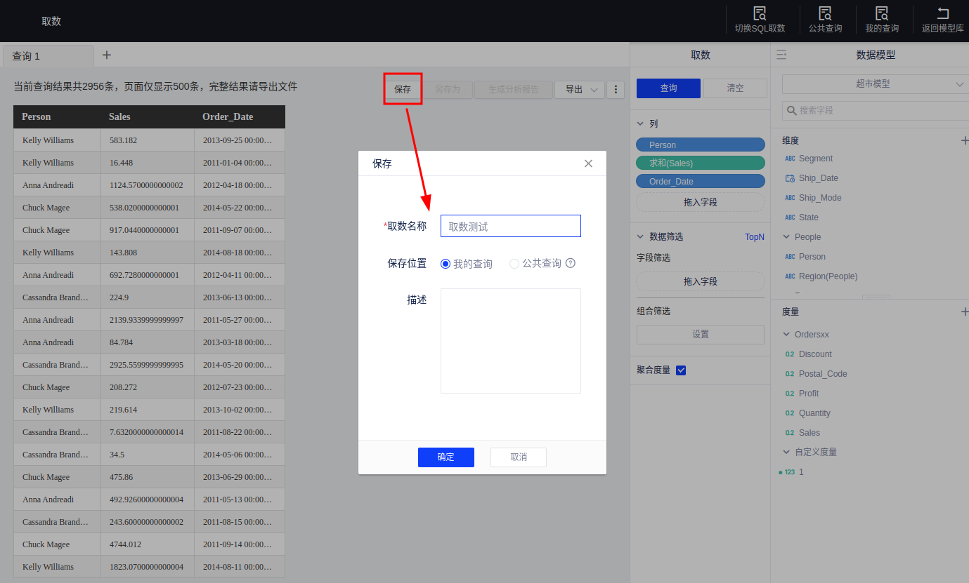 对于成功的查询结果,点击保存,保存时输入取数名称,即可快速保存: