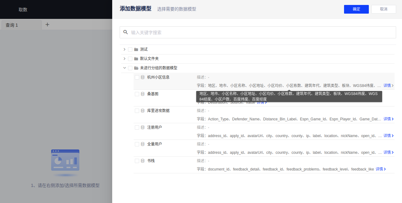 按照文件夹-数据模型的列表样式展示了有查询权限的模型,可通过模型描述和详情选择是否为所需模型;
