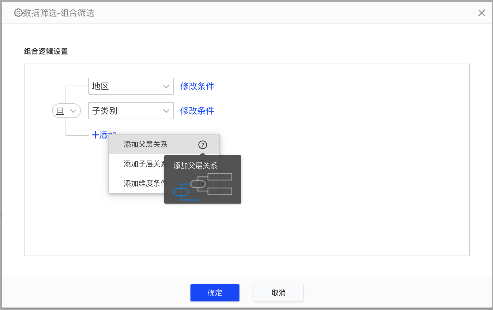 - 向上添加父层关系、向下添加子层关系,可修改添加的关系“且、或”;
