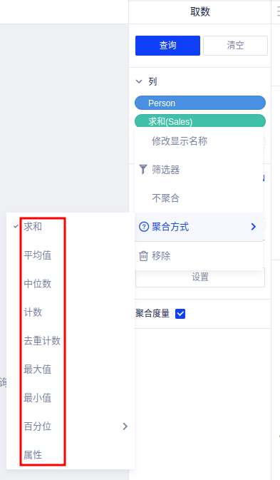 度量字段:可修改聚合方式为求和、平均值、中位数、计数、去重计数、最大值、最小值、百分位和属性;